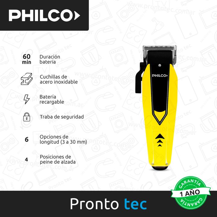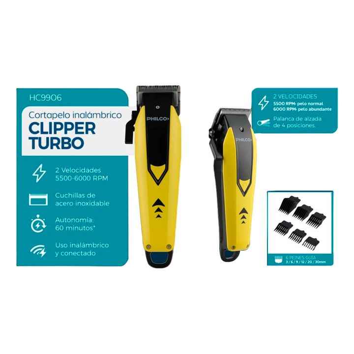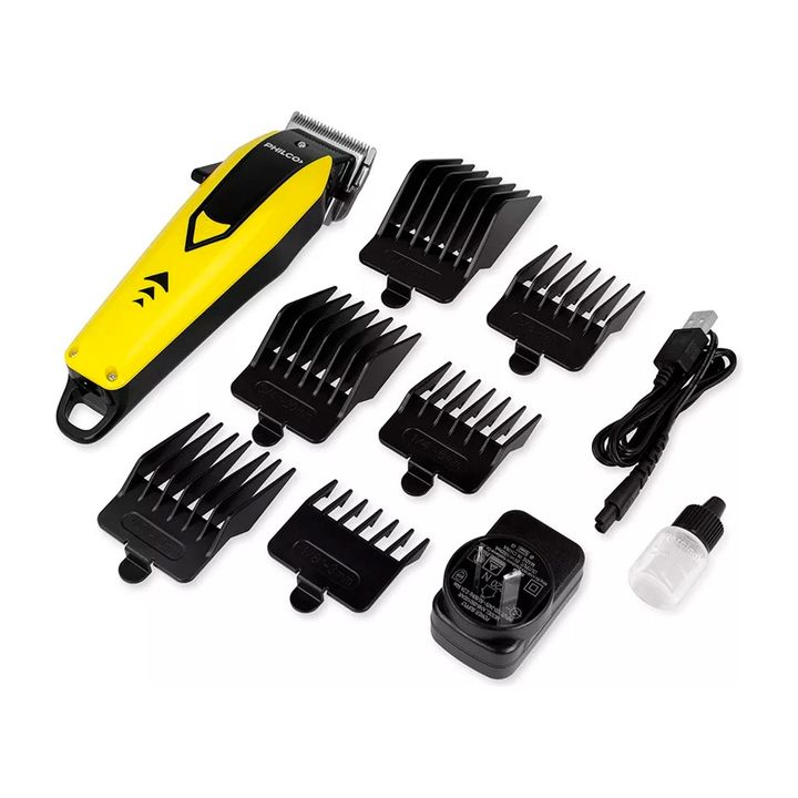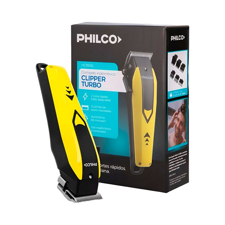 CARACTERÍSTICAS: - Marca: Philco - Modelo: HC9906PP - Inalámbrica: Si - Potencia: 10 w - Velocidades: 2 (5500 - 6000 RPM) - Cuchilla: Acero inoxidable - Peines guía: 6 (3, 6, 9, 12, 20, 30 mm) - Palanca de alzada: 4 Posiciones - Duración batería: 60 min - Peso: 570 Gr CONTENIDO DE LA CAJA: - 6 peine...