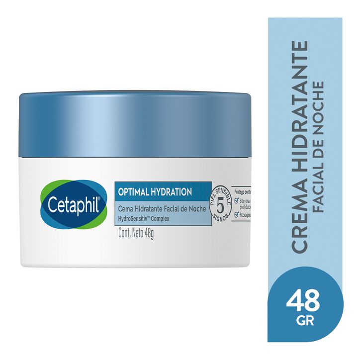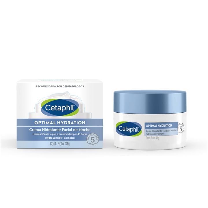 Cetaphil Optimal Hydration Crema Hidratante Facial de Noche 50g Hidratacion de la piel en profundidad por 48hs Esta crema nutriente incluye ácido hialurónico, pantenol, aceite de semilla de jojoba, aceite de brotes de bambú, extracto de margarita azul, extracto de flor de loto y extracto de raíz de ...