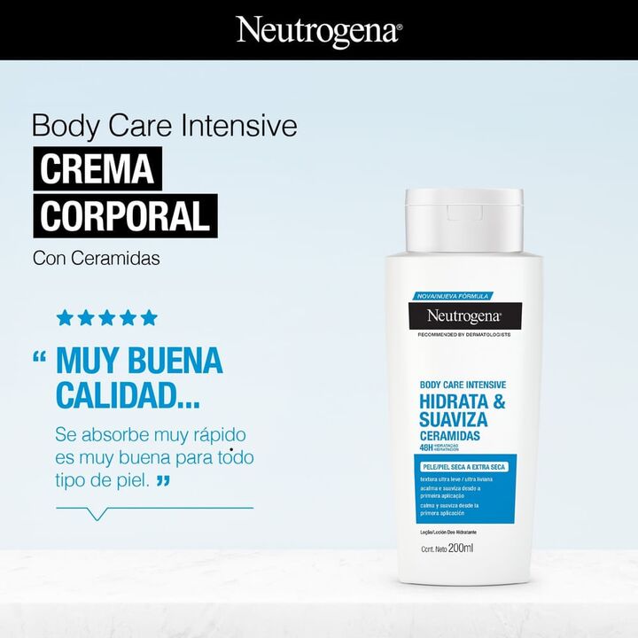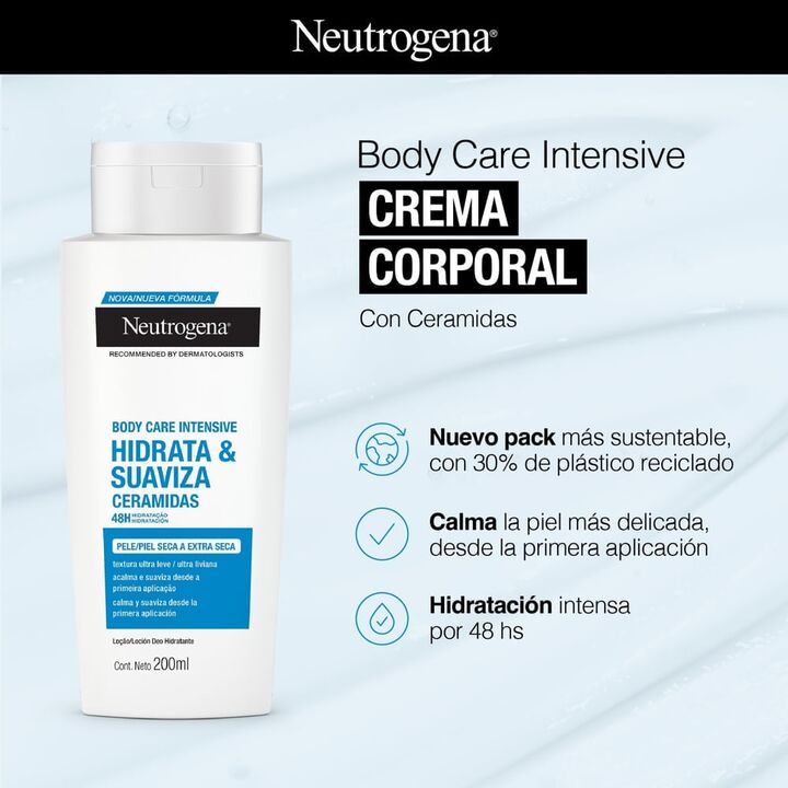 NEUTROGENA® Body Care Intensive Hidrata y Suaviza: Fórmula ligera, con acción desodorante y no grasa, desarrollada con una alta concentración de glicerina y ceramida biomimética, componente natural de la piel que protege de las agresiones externas, suavizando y calmando la piel seca. Loción desodora...