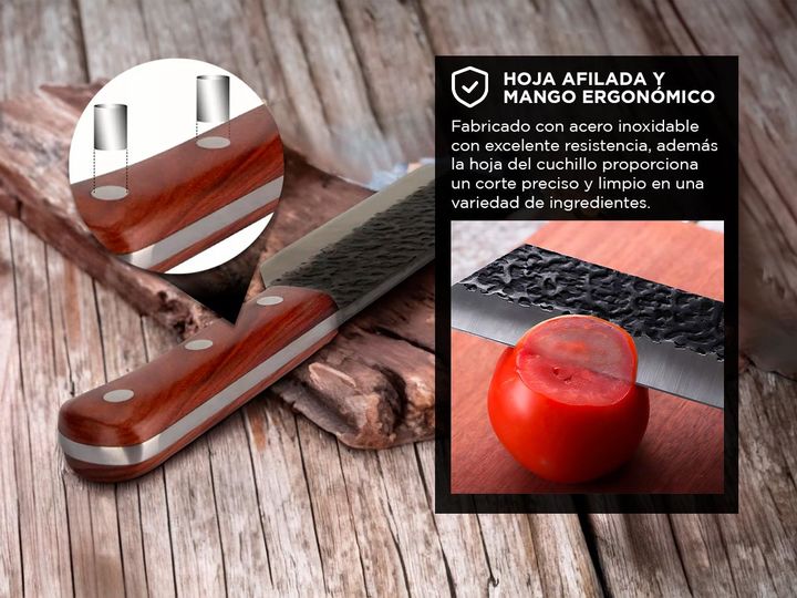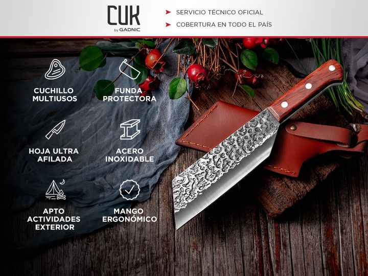 Acerca de Cuchillo de Chef Forjado Cuk By Gadnic con Funda de Piel Gadnic by Cuk presenta el nuevo cuchillo de chef con funda de cuero: Diseño Forjado: El cuchillo está diseñado con técnicas de forjado, lo que garantiza una mayor durabilidad y resistencia. Material de Alta Calidad: Fabricado con ace...