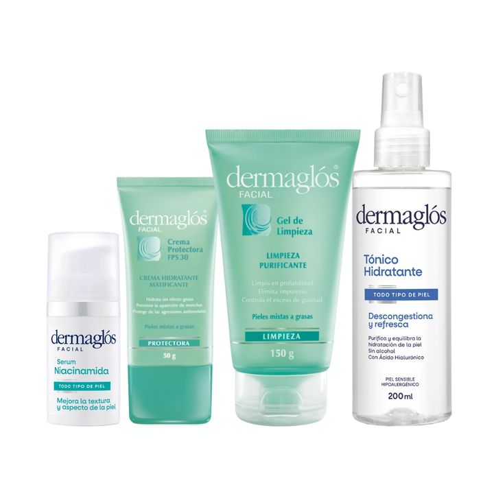 Componentes Gel Limpieza Dermaglos Purificante Piel Mixta Grasa 150 Ml Código: 7793742007583 | SKU: 008022 x 1 uni Tonico Dermaglos Hidratante Descongestivo Purificante 200 Ml Código: 7793742005053 | SKU: 008051 x 1 uni Serum Facial Todo Tipo De Piel Niacinamida Dermaglos 30 ml Código: 7793742007125...
