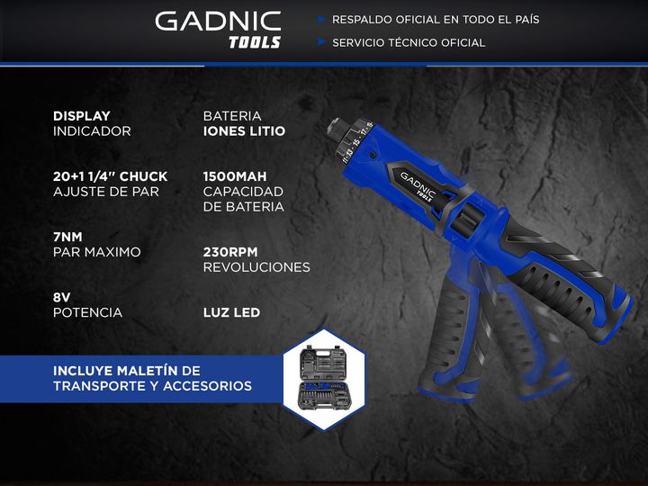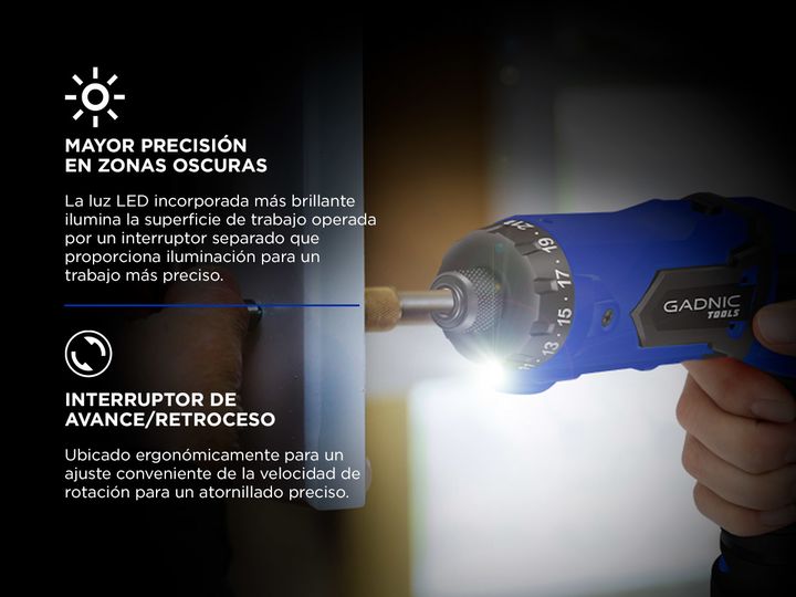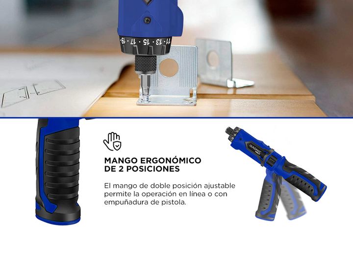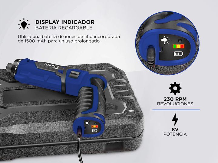 ¡Nuevo destornillador eléctrico inalambrico by Gadnic! Destornillador inalámbrico equipado con un motor de 8 V de mayor rendimiento, ofrece un par máximo mejorado de 88 in.lbs (10 Nm) para una amplia gama de aplicaciones de perforación y fijación. Modo manual par 10Nm máx. Embrague de precisión 21+1...