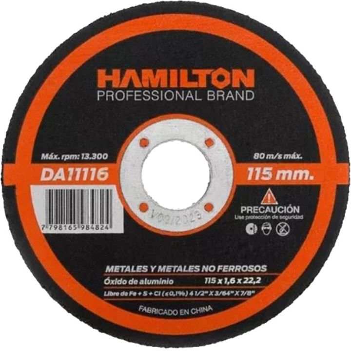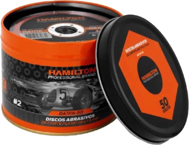 DISCO DE CORTE DA1116-50 115MM 50U HAMILTON Discos de corte abrasivos lata x 50 unidades. Para amoladora 115 mm. Grosor 1,6 mm. Fabricados en óxido de aluminio. Para corte de metales y metales no ferrosos. Hamilton DA1116-50 ¡Lata Coleccionable Hamilton Professional Brand! ¡Contiene 50 Discos! Benef...