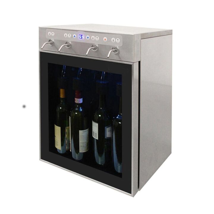ESPECIFICACIONES: Temperatura: 5-20°C Capacidad 4 botellas. Medidas 63.6 x 64.1 x 26.5 ( Alto x ancho x profundo ) cm aproximadamente Termostato digital, de 5º a 20º Sistema refrigeración : Compresor Luz: Interior LED Color: Plata IMAGENES ILUSTRATIVAS