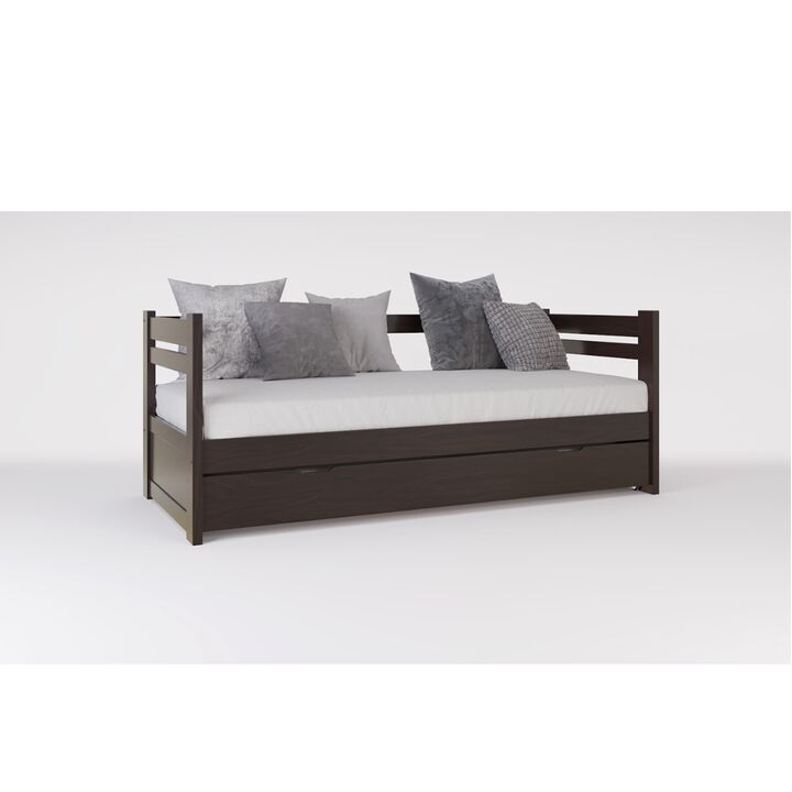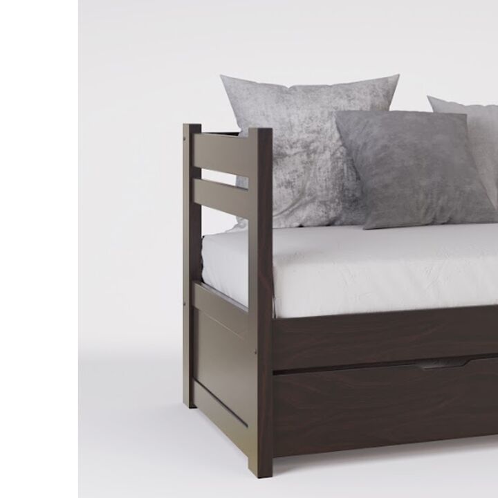 Diván cama de Pino Macizo Clear. Para colchón de 0.80 mts x 1.90 mts. Travesaño de refuerzo en el respaldo. Lustre color Caoba. No incluye carro bajo cama. No incluye colchon. Medidas: Ancho: 0.96 mts. Alto: 0.80 mts. Largo: 2.04 mts.