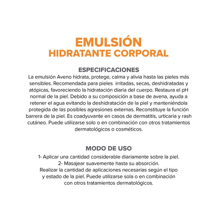 Emulsion Aveno Corporal Hidrata Humecta Piel Sensible 250ml Aveno Emulsión INFORMACIÓN DEL PRODUCTO Especialmente formulada para suavizar y calmar el prurito en caso de enfermedades eruptivas comunes de la infancia, dermatitis atópica, dermatitis de contacto irritativas y alérgicas. Está recomendada...