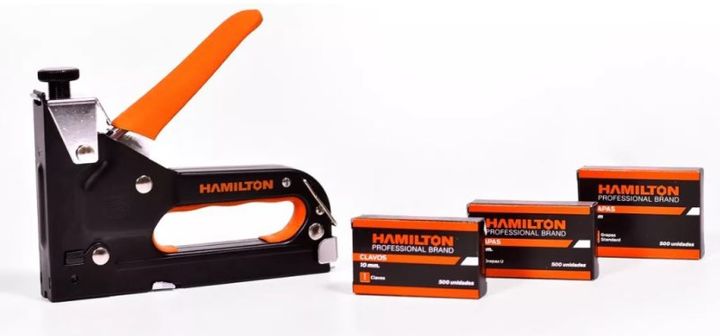 ENGRAPADORA PEPKIT 3EN1 HAMILTON ENGRAPADORA CLAVADORA PROFESIONAL 3 EN 1 Sólida fabricación en acero. # Carga por base. # Trabaja con: grapas estándar de 4 a 14 mm. grapas tipo U de 10 a 12 mm. clavos de 10 a 14 mm. # Mecanismo sencillo y rápido de usar. # Apta uso pesado. # Potencia de impacto reg...