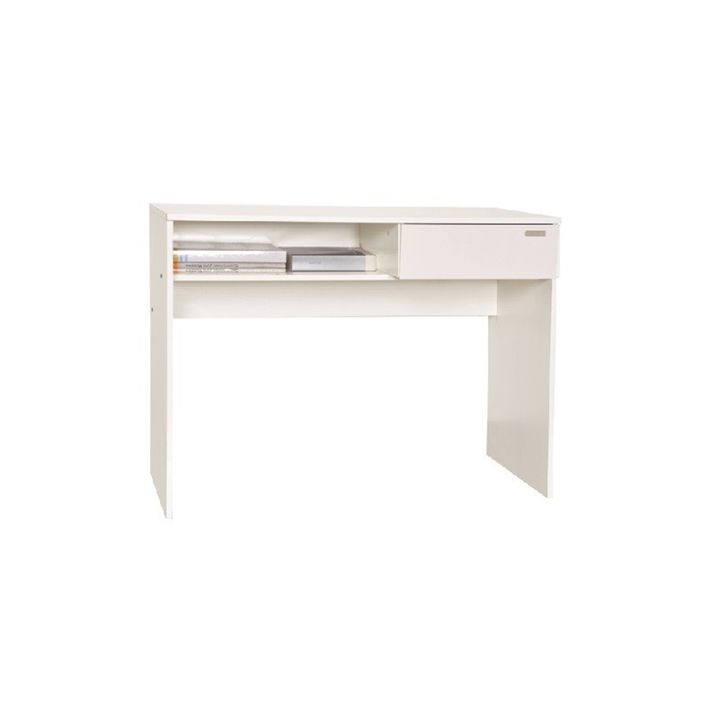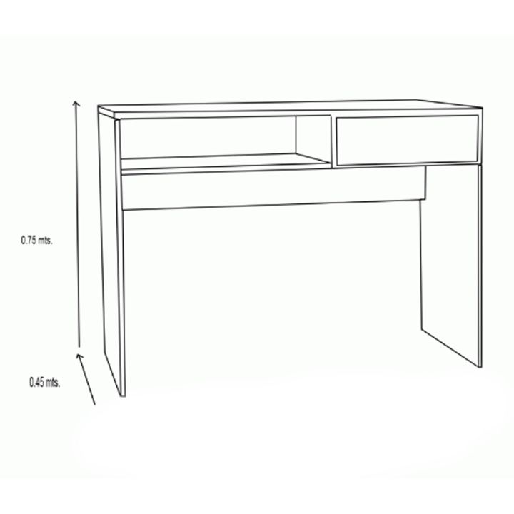 Escritorio de melamina para Notebook. Un cajón con correderas metálicas. Un estante inferior. Color Blanco (Disponible en otros colores). Medidas: Ancho: 1.00 mts. Alto: 0.75 mts. Profundidad: 0.45 mts.