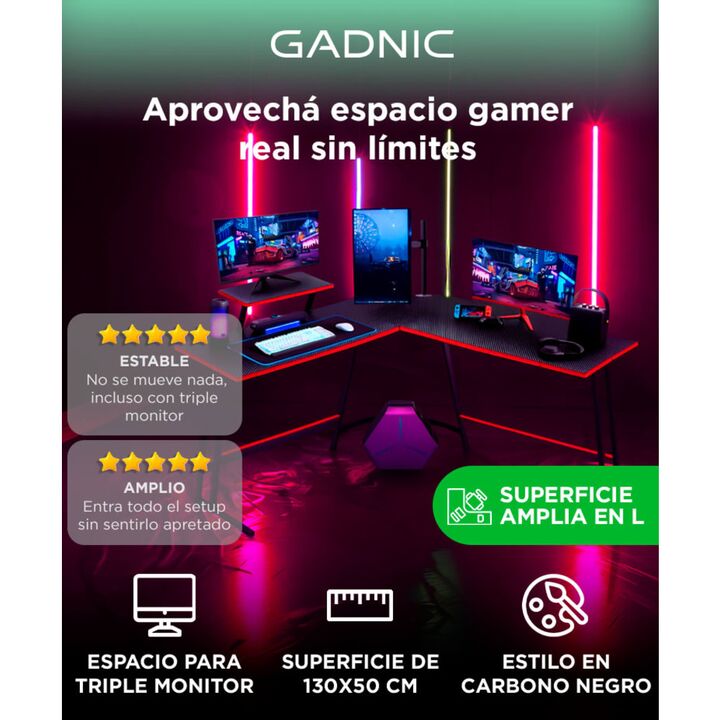 Espacio real para gaming intenso: Superficie en L de 130x50 cm para monitores, teclado, consola y más. Estructura ultra estable en Z: Acero reforzado con patas regulables que evitan movimientos molestos. Estilo gamer con fibra de carbono: Estética profesional en negro mate con textura carbono y deta...