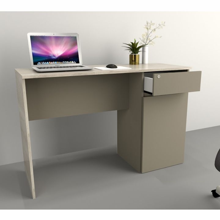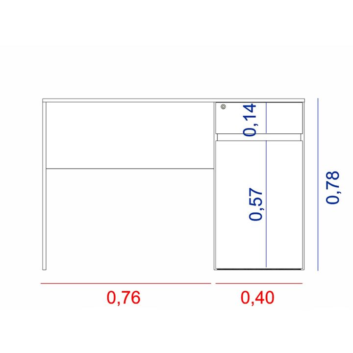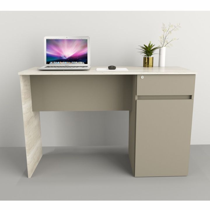 Escritorio juvenil de melamina de alta resistencia. Un cajón con cerradura y correderas metálicas. Una puerta con bisagras metálicas. Un estante interno. Sistema Minifix. Color Nevado y Gris. Medidas: Alto: 0.78 mts. Ancho: 1.16 mts. Profundidad: 0.45 mts.