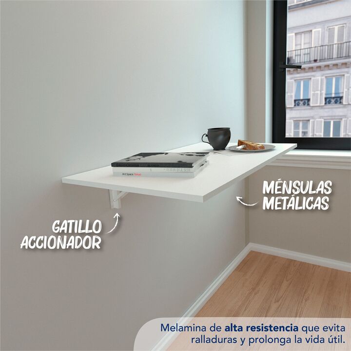 Escritorio Plegable Mesa Centro Estant 90x50 cm Home Office Modelo: SCP9050BL Melamina de Alta Resistencia que evita rayaduras y prolonga la vida útil. Con Gatillo Accionador. Fácil de plegar. Incluye ménsulas y herrajes Color: Blanco. MATERIALIDAD: • Nuestros productos están desarrollados a partir ...