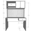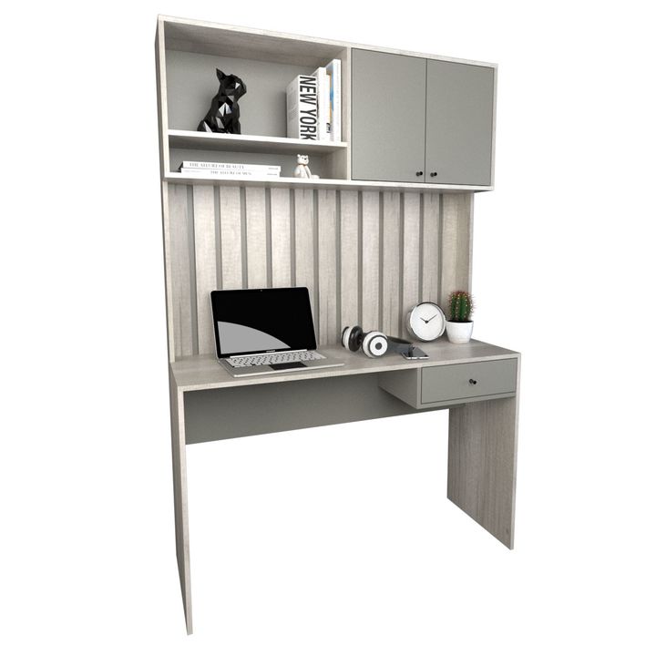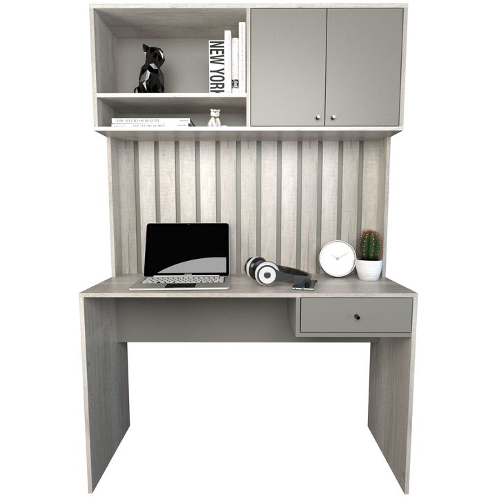 Escritorio juvenil de melamina de alta resistencia. Alzada con doble puerta y sector superior abierto de guardado y librero. Fondo varillado. Un cajón con correderas metálicas. Tiradores metálicos. Bisagras metalicas. Alacena autoportante. Sistema Minifix. Medidas: Ancho: 1.15 mts. Alto total: 1.77 ...