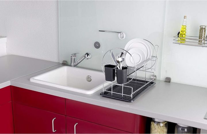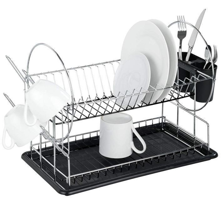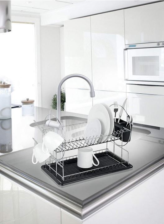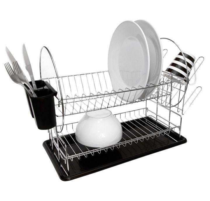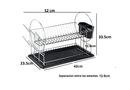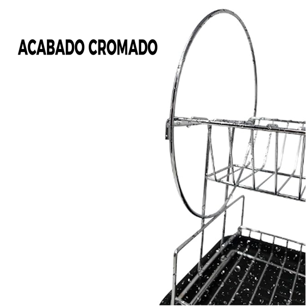 ESCURREPLATOS CROMADO DOBLE CHICO SKU: 142441 Secaplatos cromado dos niveles con bandeja, cubiertero doble y porta vasos. Modelo chico Características -Dos niveles - Viene con bandeja escurrecubiertos doble de pp y porta vasos. -Para apoyar en mesada -material alambre de acero cromado . -Grosor del ...