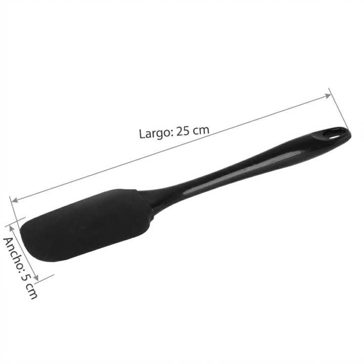 Espátula de Silicona con mango de plástico Largo: 25 cm Ancho: 5 cm BPA FREE Aprobado por Instituto Nacional de Alimentos (INAL). ANMAT Resiste -40°a 200°c Apto para microondas Apto para lavavajillas No se pega BPA FREE Origen: China Con ojal para colgar