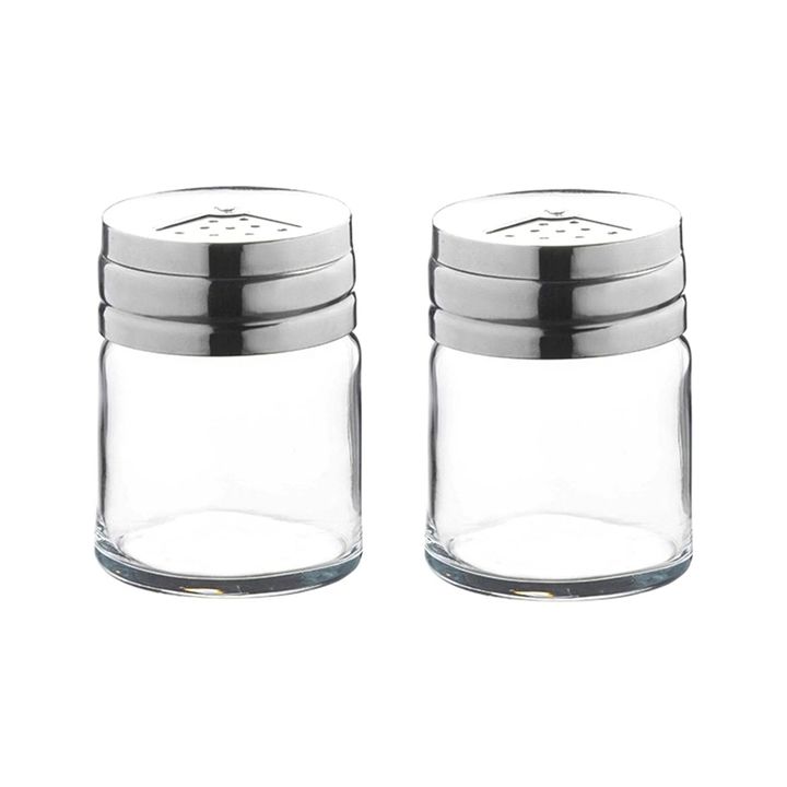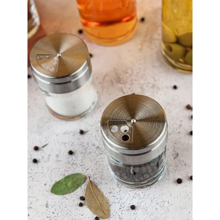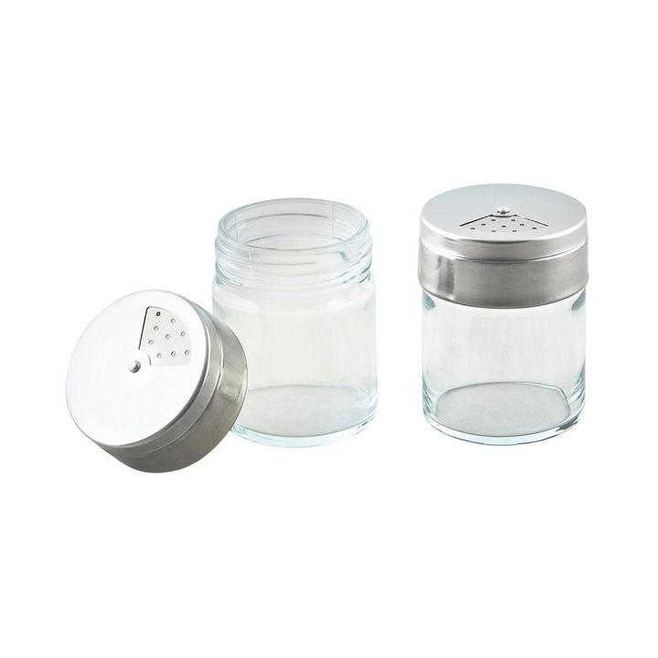 Set compuesto x 2 unidades Frascos de vidrio con tapa de metal a rosca con 3 tipos de dosificador en la tapa permitiendo colocar desde sal , semillas , pimienta, todo tipo de especies. Tiene 3 agujeros para dosificar de diferente forma y tambien para CERRAR ( GIRATORIO) Medida : Altura : 7 cm. / Dia...