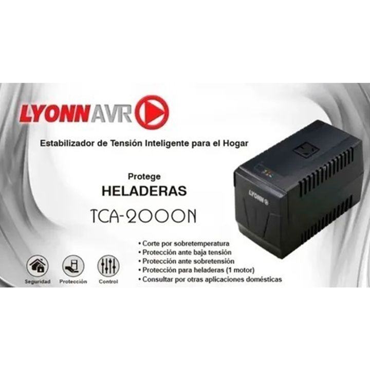 ESTABILIZADOR LYONN TCA-2000N PARA HELADERA 1 TOMA - TCA-2000N - Marca: LYONN. - Modelo: TCA-2000N. - Capacidad: 2000VA. ESPECIFICACIONES TÉCNICAS: - Entrada: Voltaje 220 VCA. - Rango de voltaje: 176 - 275 VCA. - Rango de Frecuencia: 50hz. - Salida: Voltaje 220 VCA. - Regulación de Voltaje +/- 10% (...
