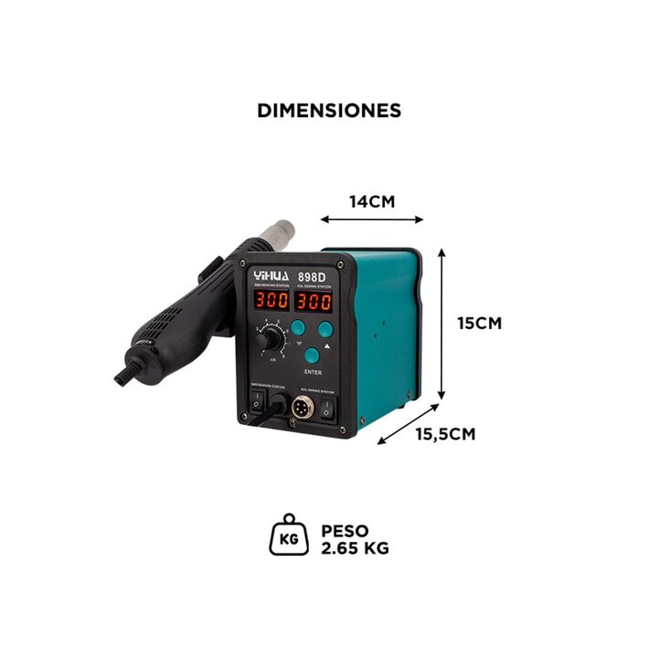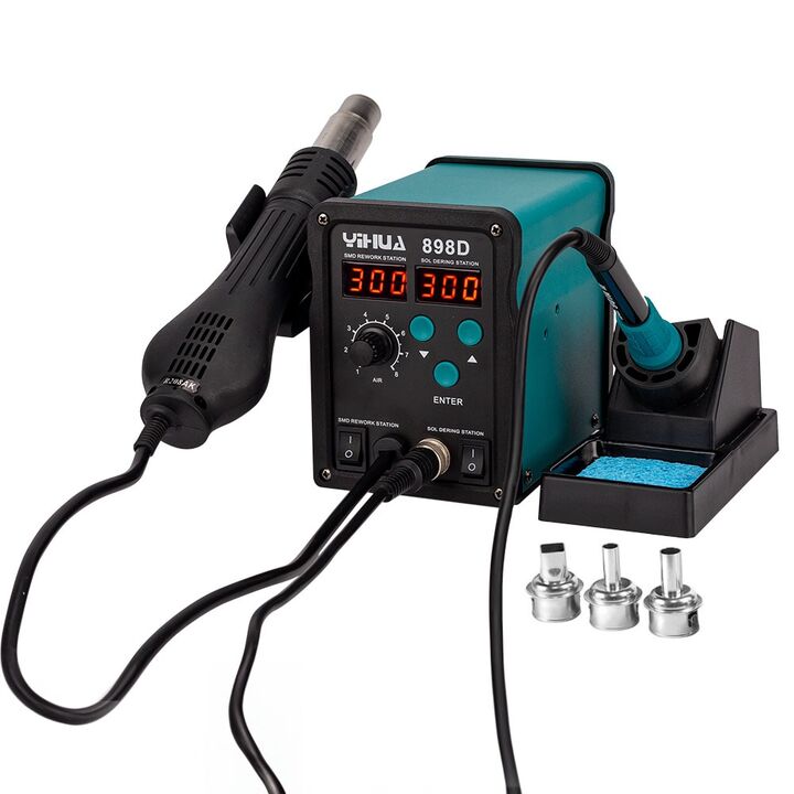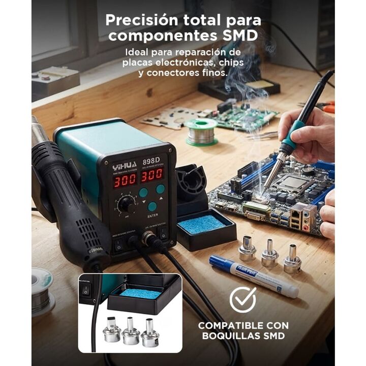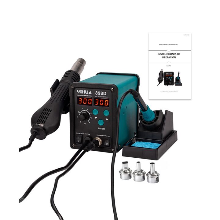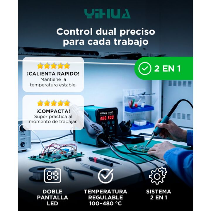 ¡Nueva Estación de Soldado Yihua 898D! El cuerpo de aleación de metal con carcasa de silicona de alta calidad presenta una apariencia elegante y ahorra energía. Puede usar pistola de aire caliente y soldador por separado, sin interferencias entre sí. Circuito de control de chip PID adoptado, asegura...
