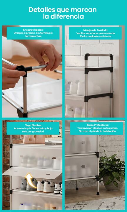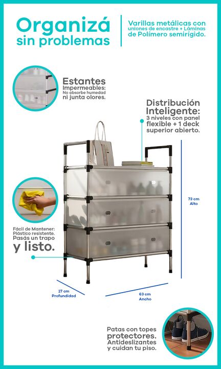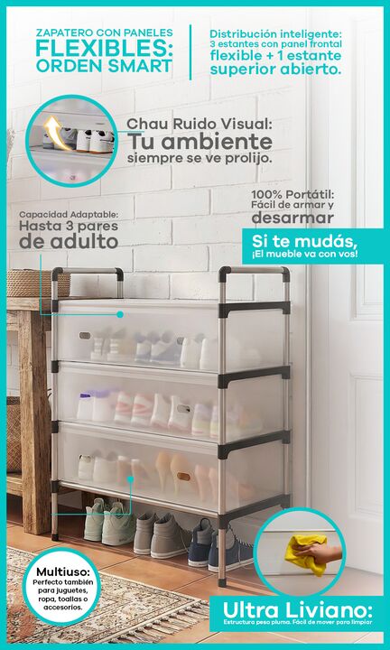 Estantería Zapatero Botinero Organizador 3 Niveles Estantes con paneles flexibles Nuestro mueble organizador de zapatos destaca por su capacidad real. Podes guardar 12 pares grandes o maximizar el espacio hasta 16 pares chicos y/o medianos. La solución ideal para eliminar el desorden visual y manten...