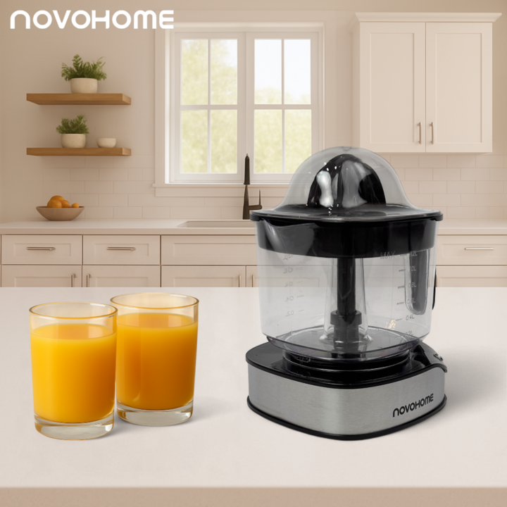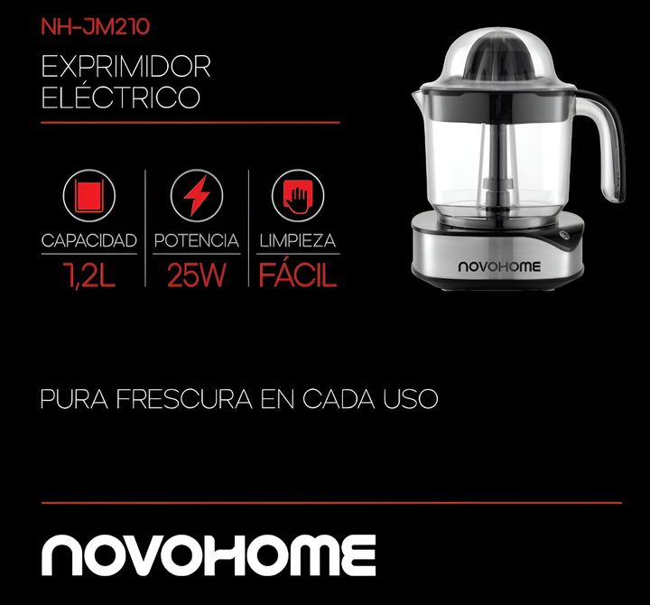 NOVOHOME EXPRIMIDOR 25W 1.2LTS SKU: NH-JM210 DESCUBRE UN MUNDO DE JUGOS FRESCOS El exprimidor Novohome redefine la experiencia de preparar jugos frescos con su diseño simple y eficiente. Su fácil manejo permite obtener bebidas deliciosas y refrescantes en cuestión de segundos. Sus piezas desmontable...