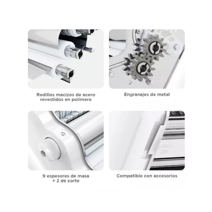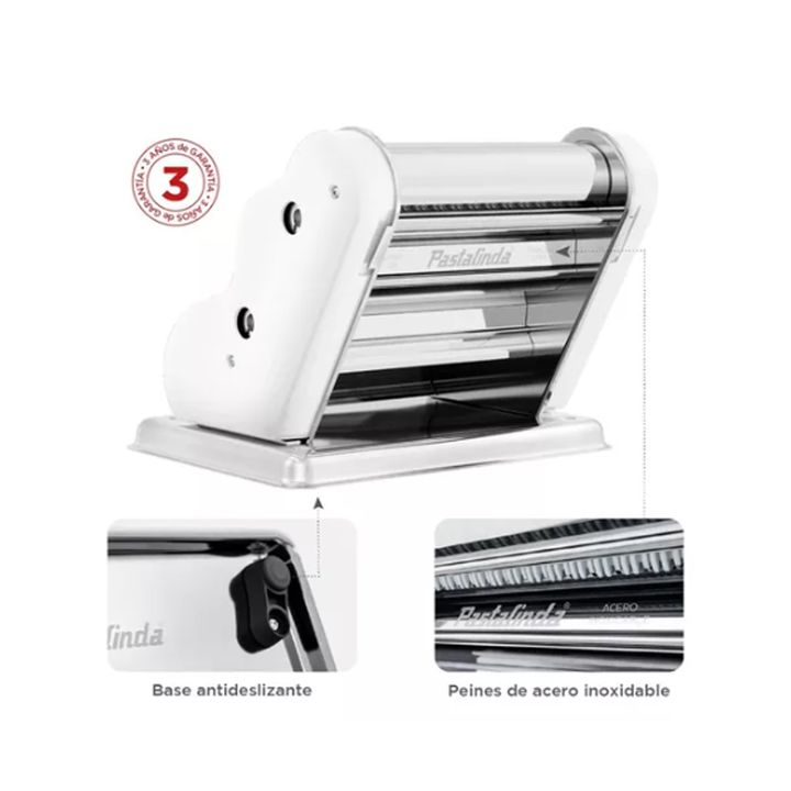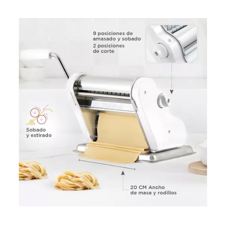 Máquina elaboradora de Pasta Casera. Fácil de usar y con un diseño único y personalizado que te permitirá preparar mayor cantidad de pasta en menos tiempo, gracias a sus 20cm de ancho de masa. Características: • Nuevos engranajes de metal (estirado) • Ancho de rodillo/hoja de masa 20 cm • 9 posicion...