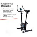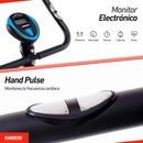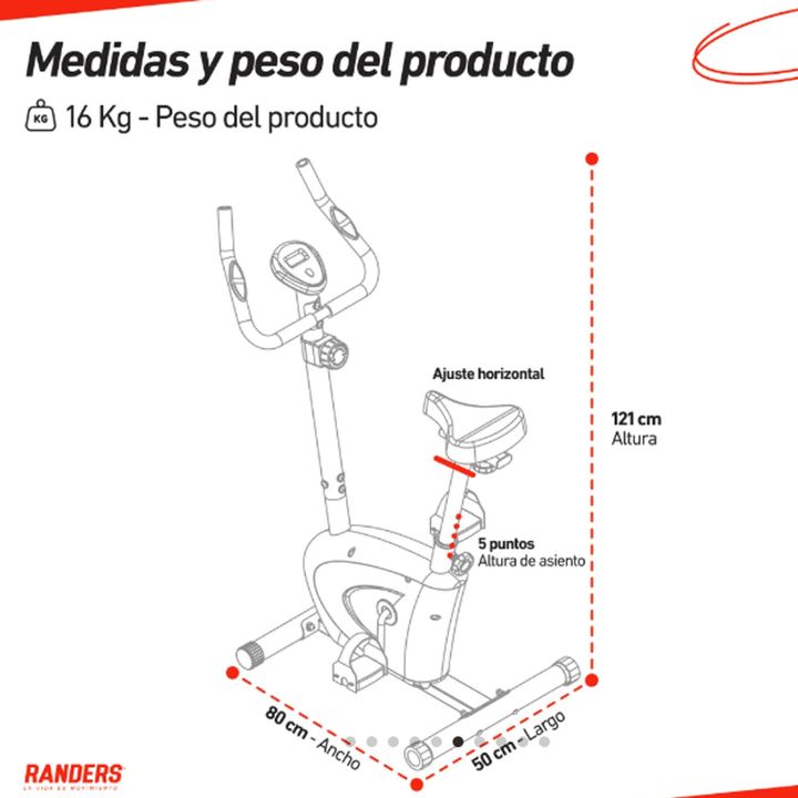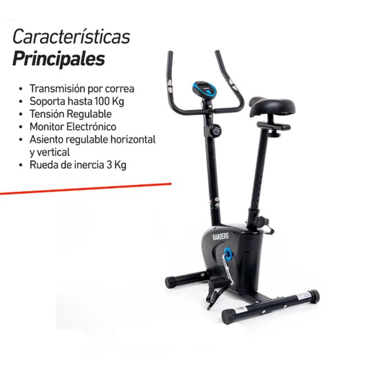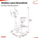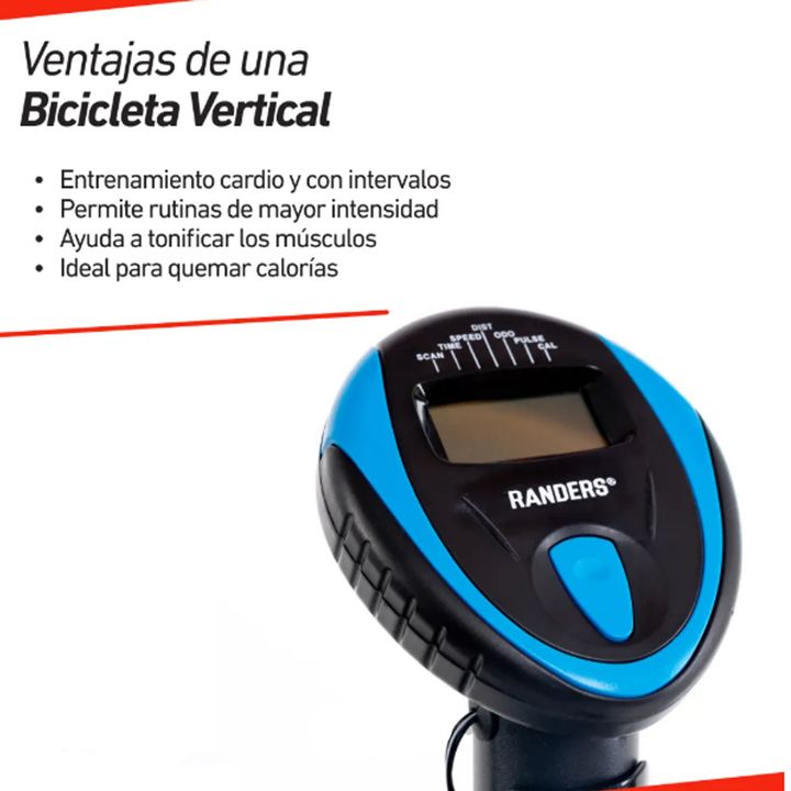 Bicicleta magnética vertical. CARACTERÍSTICAS PRINCIPALES Rueda de inercia de 3kg. Sistema de transmisión por correa. Soporta hasta 100Kg. Asiento con regule vertical y horizontal. 8 niveles de resistencia. Consola que muestra Tiempo, Distancia, Velocidad, Calorías quemadas, odómetro y pulso cardíac...