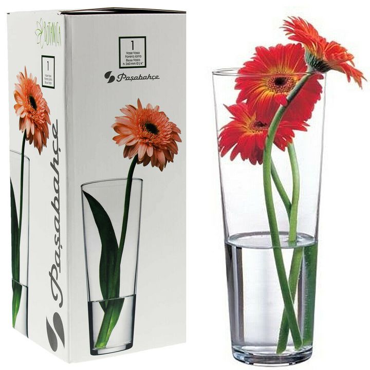 Florero de vidrio , la mejor calidad en vidrio transparente. Medida : altura 26 cm Diámetro de la base: 7 cm diámetro de la boca : 10 cm Hermoso regalo !!! Caja de regalo Origen Turquía Marca : PASABAHCE