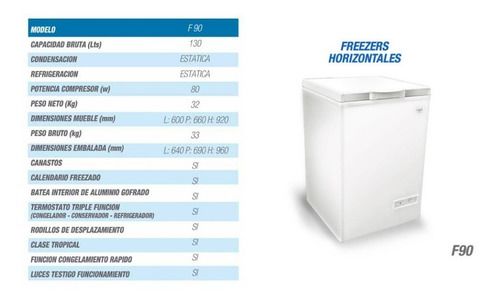 Freezer horizontal Frare F90 de 130 litros con eficiencia energética C. Funciona como freezer y enfriador, incluye 1 puerta y 1 cesto interior de plástico. Dimensiones: 92 x 60 x 60 cm, peso: 33 kg. | Código Interno: 310177 | Modelo: F90 | Capacidad: 130 litros | Ean: 7797062000361 | Alto: 92 cm | A...