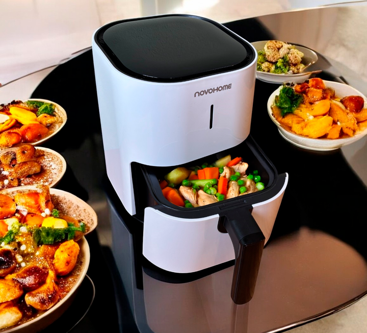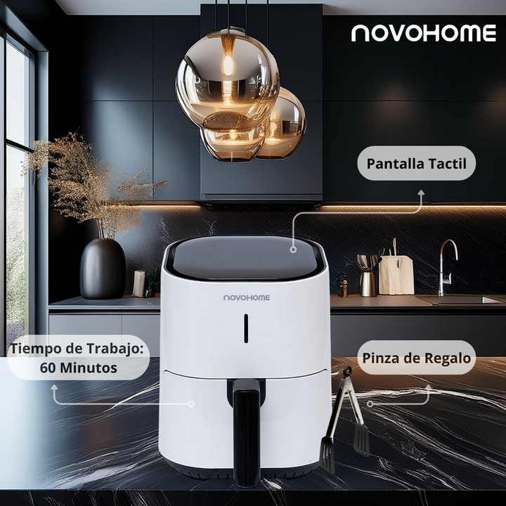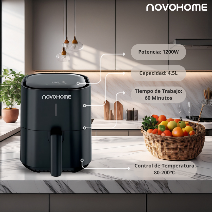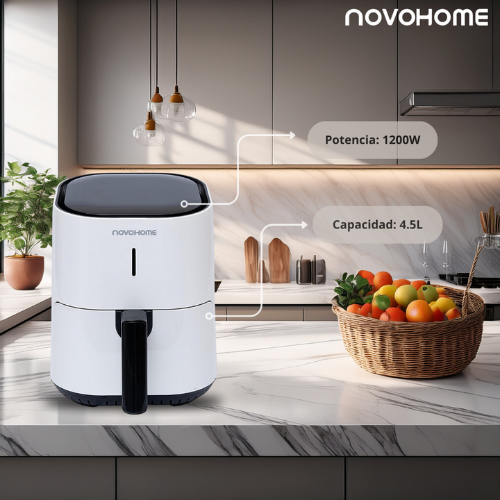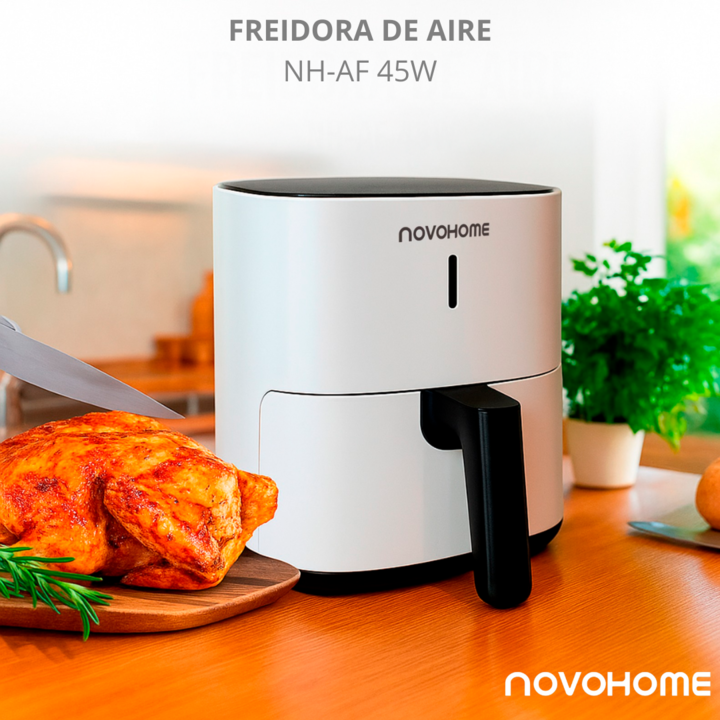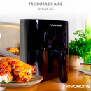 NOVOHOME AIRFRYER NH-AF 45 4 LITROS 1200W SKU NEGRA: NH-AF 45N SKU BLANCA: NH-AF 45W TEXTURA CRISPY, SIN ACEITE Tecnología Fry Force 360°: Cocina los alimentos de forma rápida y uniforme con poco o nada de aceite. Los alimentos quedan crujientes por fuera y jugosos por dentro mientras que se utiliza...