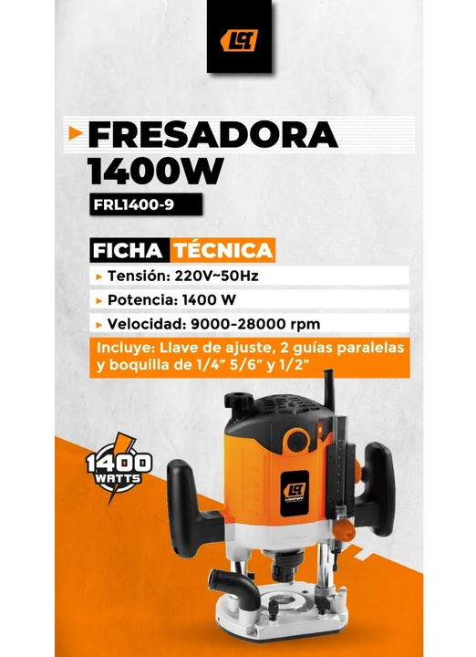 FRESADORA LUSQTOFF FRL1400-9 ROUTER 1400W 3 BOQUILLAS + GUIA CARACTERISTICAS: • Permite crear piezas de diseño con distintas formas y tamaños. • Permite regular la profundidad máxima del fresado en función del tipo de corte. • Cuenta con una guía paralela perfecta para seguir tus marcas o trazos al ...