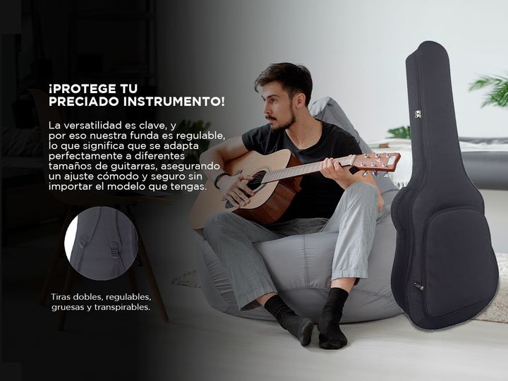 ¡Protege tu preciado instrumento con nuestra Funda de Guitarra! La versatilidad es clave, y por eso nuestra funda es regulable, lo que significa que se adapta perfectamente a diferentes tamaños de guitarras, asegurando un ajuste cómodo y seguro sin importar el modelo que tengas. Además, las tiras do...