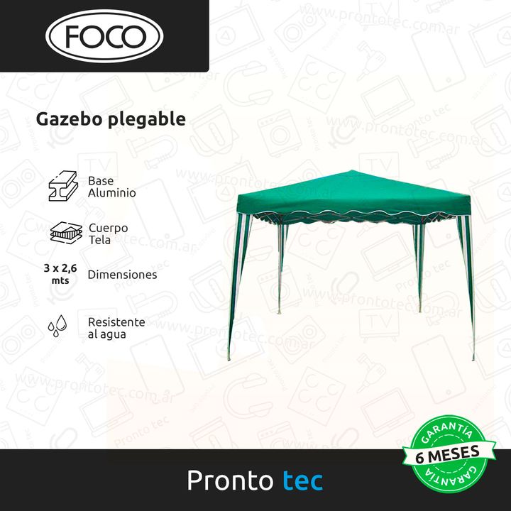 CARACTERÍSTICAS: - Marca: Foco - Modelo: Plegable - Material estructura: Aluminio - Resistente al agua: Si - Plegable: Si - Dimensiones (AnxAlxPr): 3 x 2 x 2,6 Mt - Peso: 11,2 Kg - Garantía oficial CONTENIDO DE LA CAJA: - Manual de usuario