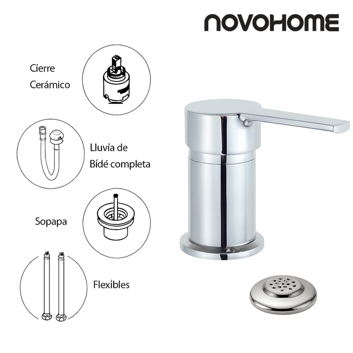 NOVOHOME GRIFERÍA MONOCOMANDO P/BIDET CROMO SKU: NH-GB27CR Grifo de lavabo, cuerpo acero inoxidable, cartucho cerámico de 35 mm, manija de Metal, manguera trenzada de 40 cm, con escurridor de lavabo y rociador. La grifería monocomando baja para lavatorio cromada es una opción moderna y funcional dis...