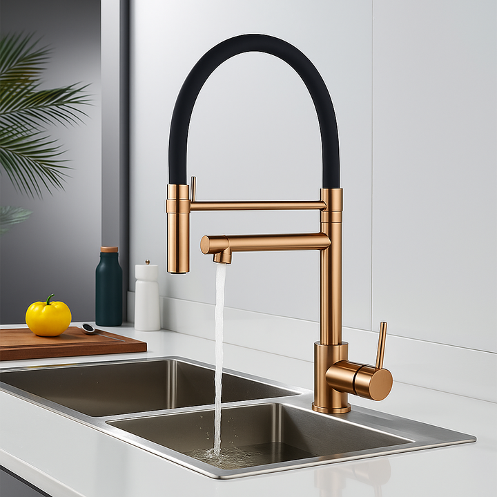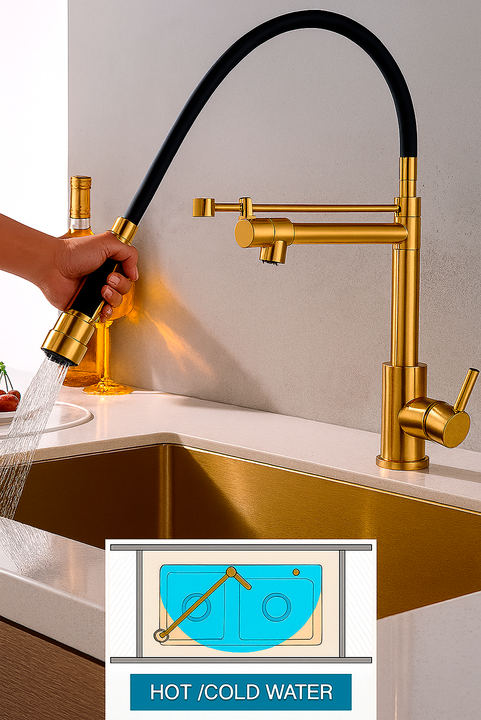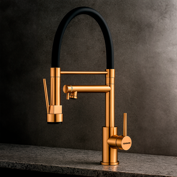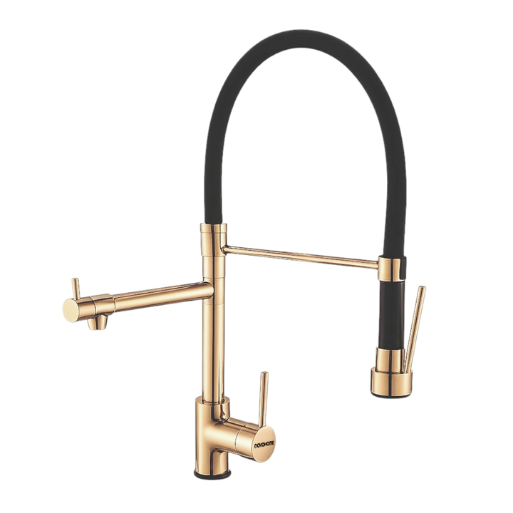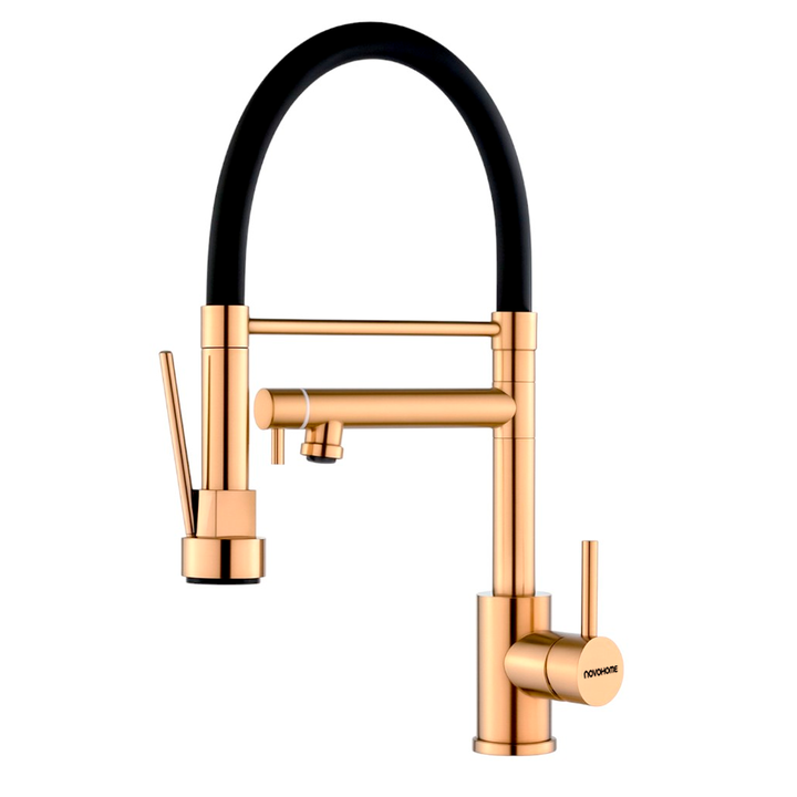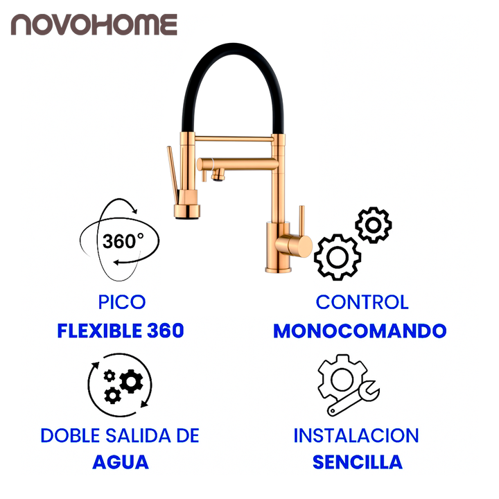 NOVOHOME GRIFERÍA MONOCOMANDO PARA COCINA DOBLE FLEXIBLE GOLD SKU: NH-GC-150G Cuerpo de acero inoxidable, cartucho cerámico de 35 mm, manija de acero inoxidable, con manguera tejida de 60 cm Con un diseño moderno y elegante, su tecnología monocomando permite un control preciso del agua, ajustando fá...
