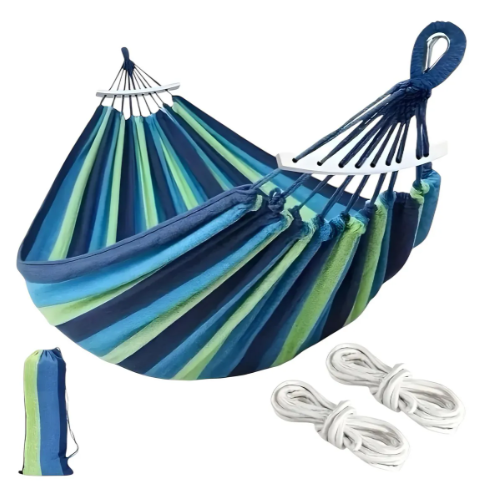 Tu compañera ideal para escapadas de camping o para crear un oasis de paz en tu jardín.Fabricada con polietileno trenzado y tejido para soportar un alto peso (hasta 200 KG) y equipada con un amarre súper resistente, esta hamaca garantiza horas de descanso. Su diseño portátil y versátil te permite ll...