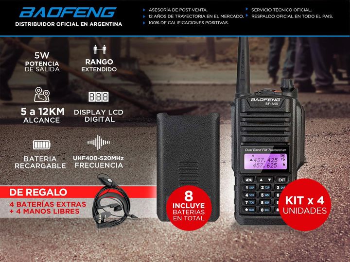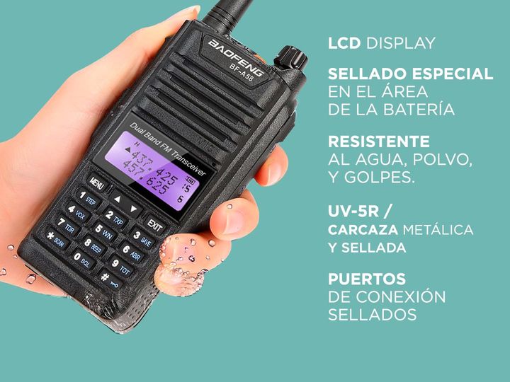 Rango de frecuencia (UHF Y VHF) 136-147 MHz 400-520 MHz + FM RADIO 88-108Mhz Handy Bibanda 5W IP-57 resistente al agua y al polvo. Rango de Comunicación (entre dos Handys) 5 a 12 km Capacidad 128 canales Separación entre canales 2.5/5/6.25/10/12.5/20/25 Khz Tensión Operado 3.7 V Batería H – 1800mAh ...