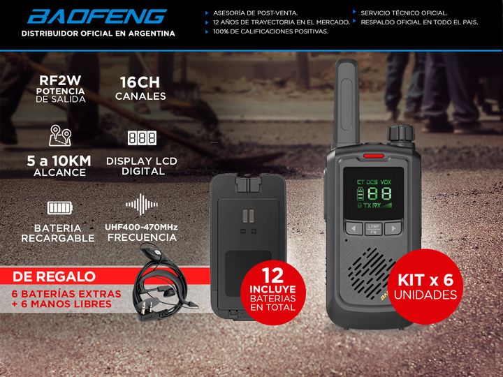 Nueva Versión Con Display Digital del handy más confiable, estable y vendido del mercado con auricular manos libres de regalo. Alcance de 3 a 5km en ciudad o 5 a 10km al aire libre. Ideal para caza, pesca, montañismo, vigilancia del medio ambiente, radioaficionados, comunicación entre dos casas o en...