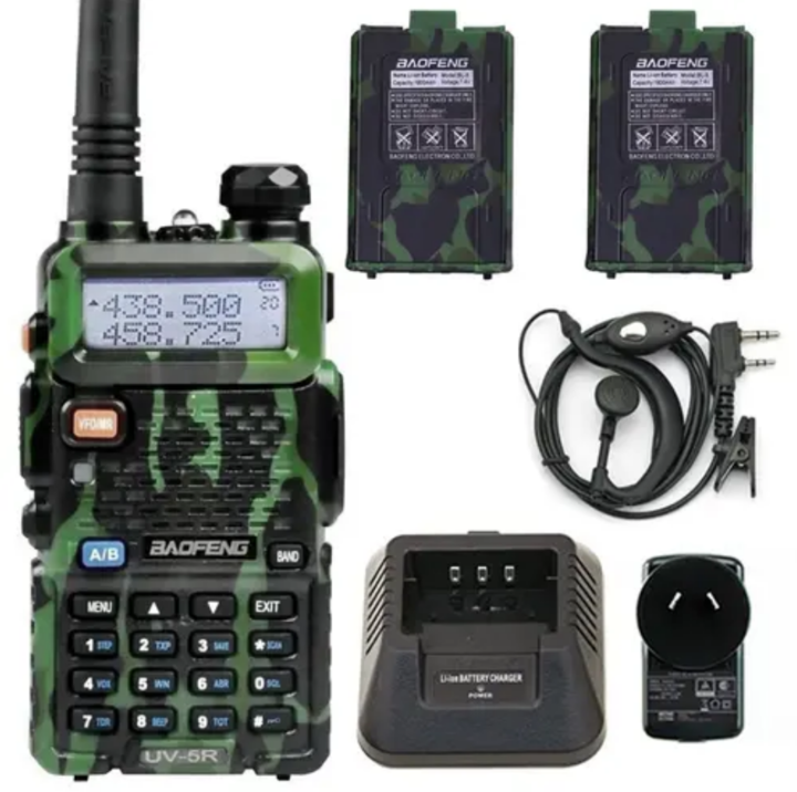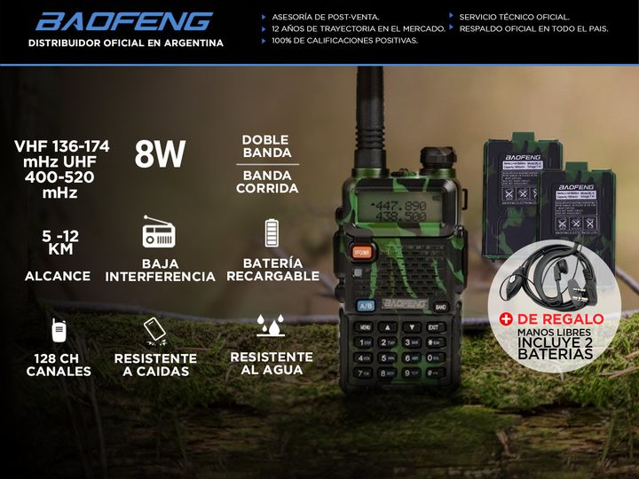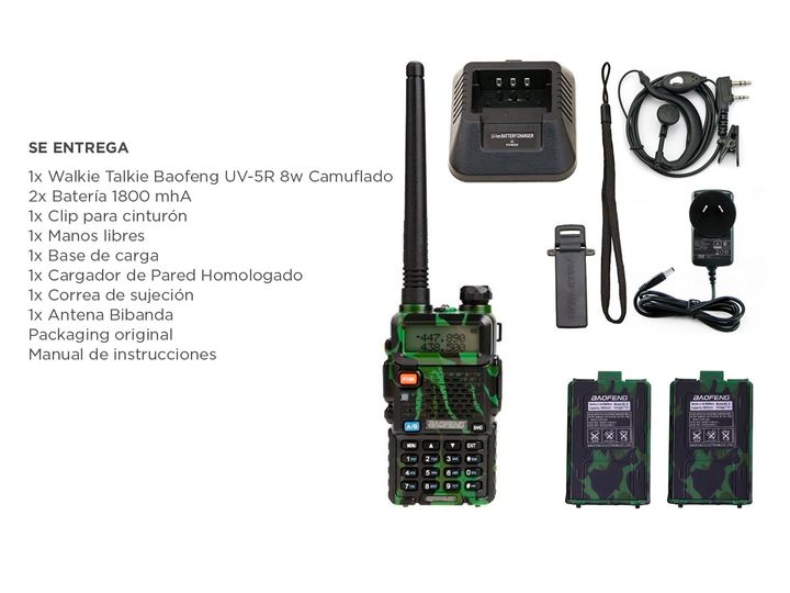 Descubre la nueva versión del Handy Baofeng UV5R 8 Watt, el walkie-talkie más confiable, estable y vendido en el mercado. Equipado con batería extra, auricular manos libres, base de carga y cargador de pared homologado, este handy es perfecto para una amplia gama de actividades al aire libre. Ideal ...