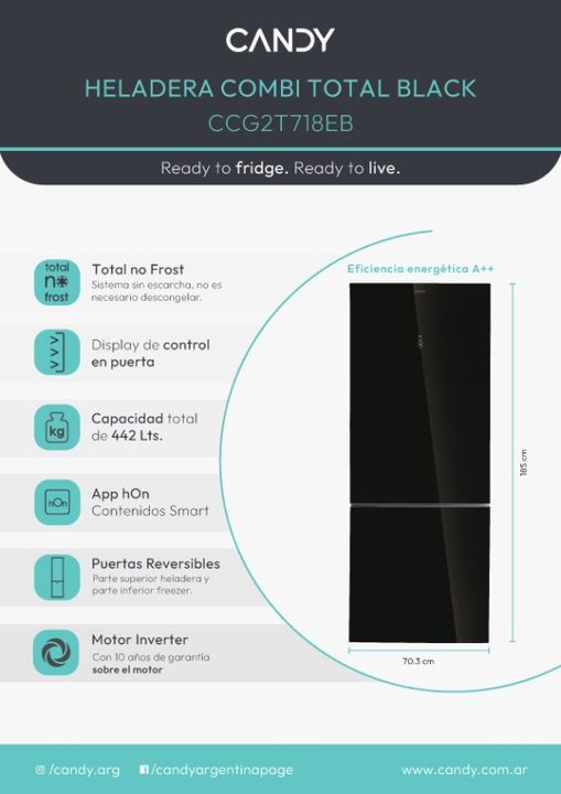 HEL 442L CCG2T718EB COMBI NF INV NG CANDY -Tecnología de refrigeración Total No Frost -Cantidad de puertas 2 -Motor Inverter -Capacidad neta (Lts) 442 -Lineal Combi -Conectividad Contenidos Smart -App hOn -Compartimento Heladera total (L) 327 -Compartimento Freezer Total (l) 115 -Tipo de Control Dis...