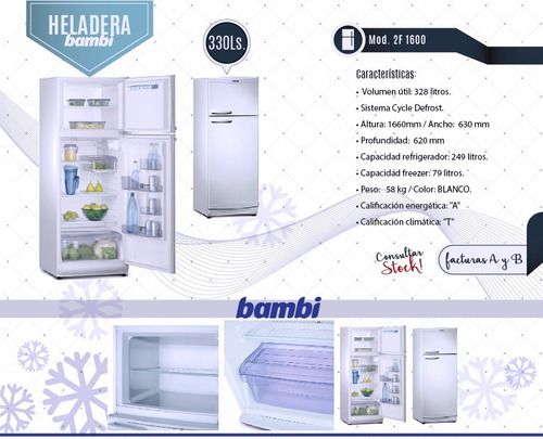 Heladera Bambi 2F1600: practicidad y espacio en un solo equipo. 330 litros de capacidad total, con freezer de 79 L y refrigerador de 249 L. Estantes regulables, compartimientos para frutas y verduras y luz interior. Diseño blanco, clásico y eficiente (A) para mantener tus alimentos frescos siempre. ...