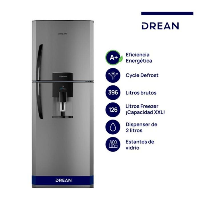 Heladera con freezer cíclica. Eficiencia energética A+. Color gris. Gas ecológico R600a. Capacidad bruta 396 litros. Capacidad neta 392 litros. Dispenser de 2 litros de capacidad. Estantes de vidrio templado en refrigerador regulables en altura para una mayor resistencia. Estantes de alambrón en fre...