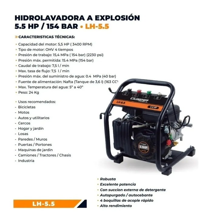 Hidrolavadora Explosión 154bar 5,5hp Manguera Lusqtoff Lh5.5 FICHA TÉCNICA • Capacidad del motor: 5,5 HP (3400 RPM) • Tipo de motor: OHV 4 tiempos • Presión de trabajo: 15,4 Mpa (154 bar) (2230 Psi) • Presión máx. permitida: 15.4 Mpa (154 bar) • Caudal máx. de trabajo: 7,5 l/min. • Tasa máx. de fluj...
