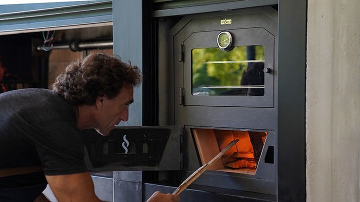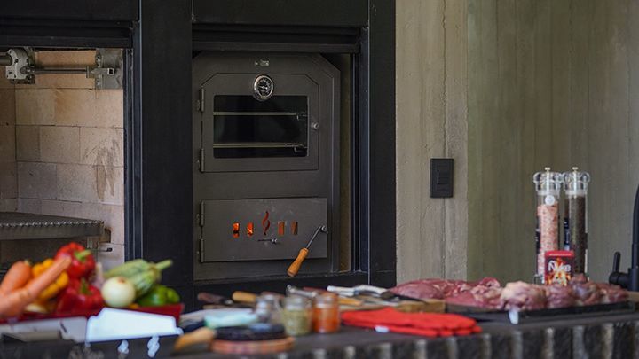 Horno a lena de calor envolvente. En la camara de combustion de refractarios se quema la lena y sus gases los cuales chocan con el deflector y se dirijen hacia los laterales y luego hacia el techo por donde sale por la chimenea de esta forma envuelve el calor al horno interno el cual esta enlozado y...