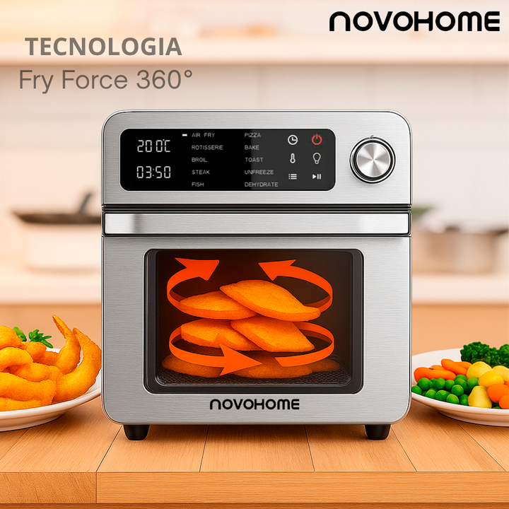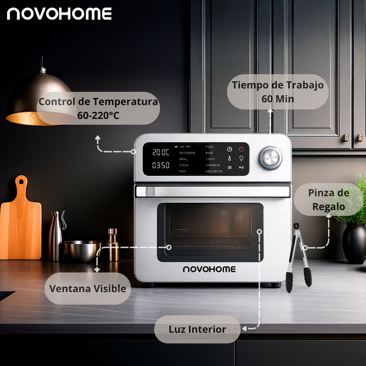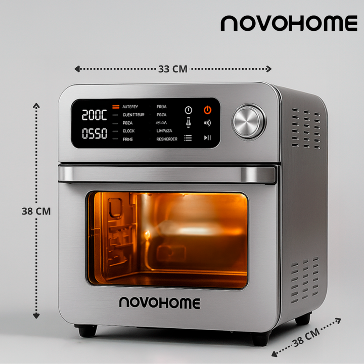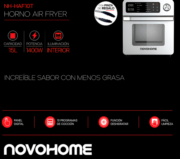 NOVOHOME HORNO AIRFRYER DIGITAL 1400W 15LTS SKU: NH-HAF10T PLATOS MAS SANOS Y SABROSOS El horno air fryer Novohome te permite disfrutar de platos deliciosos y saludables con poco aceite. Su tecnología Fry Force 360° distribuye el calor de manera uniforme, logrando resultados crujientes por fuera y t...
