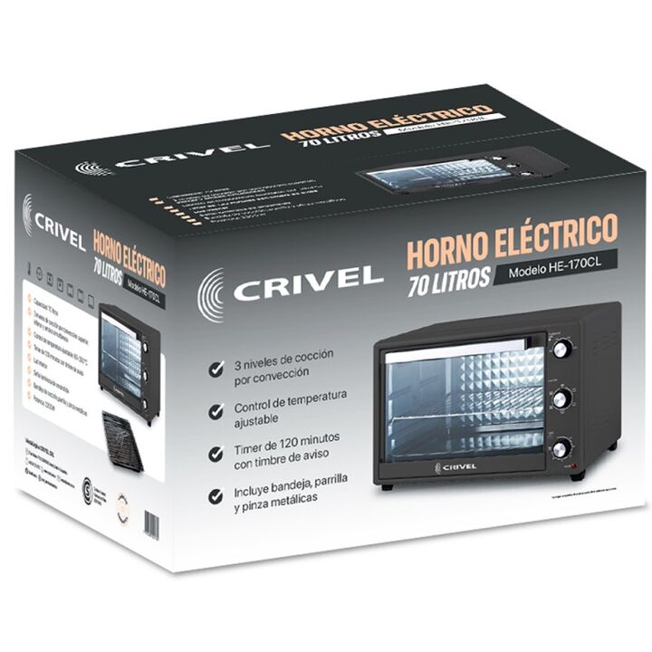 HORNO EL¦%CTRICO HE-170CL 70L 2200W NG CRIVEL - Dimensiones: 42 cm de alto, 64 cm de ancho y 49 cm de profundidad. - Volumen: 70 litros. - Peso: 11,6 kg. - Luz interior. - Cocci¦nn por convecci¦nn. - Tres niveles de cocci¦nn: superior, inferior o ambos. - Timer 120 con timbre de aviso. - Control de ...