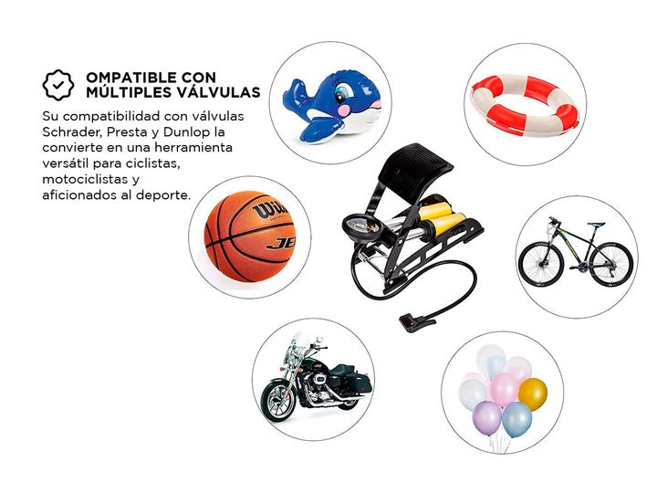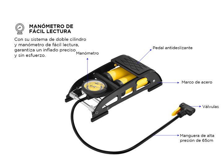 La inflador de Pie de Alta Presión es la solución ideal para inflar todo tipo de neumáticos de manera rápida y eficiente. Con su sistema de doble cilindro y manómetro de fácil lectura, garantiza un inflado preciso y sin esfuerzo. Fabricada con materiales resistentes como el aluminio y acero, y equip...