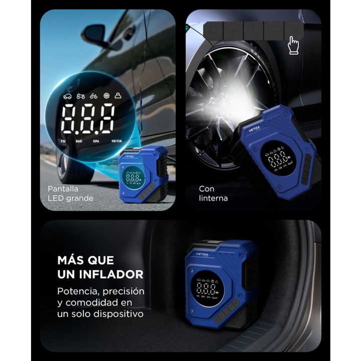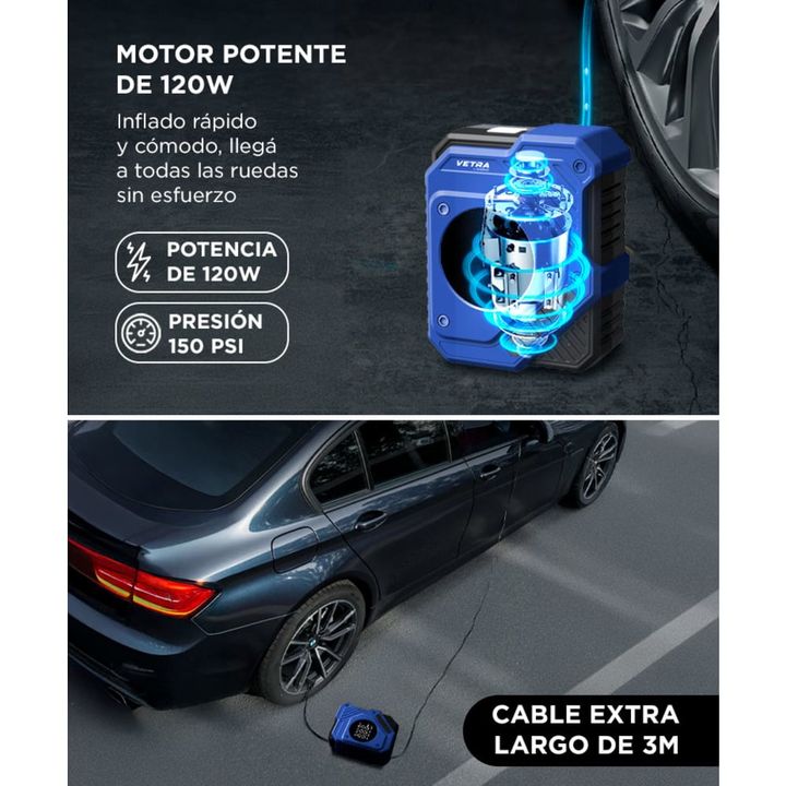 Inflado rápido, preciso y sin esfuerzo: Equipado con motor de 120W y un flujo de aire de 23 L/min, este inflador alcanza hasta 150 PSI y se detiene automáticamente al llegar a la presión configurada. Ideal para mantener neumáticos de auto, moto o bici siempre listos, sin riesgos de sobreinflado. 5 m...
