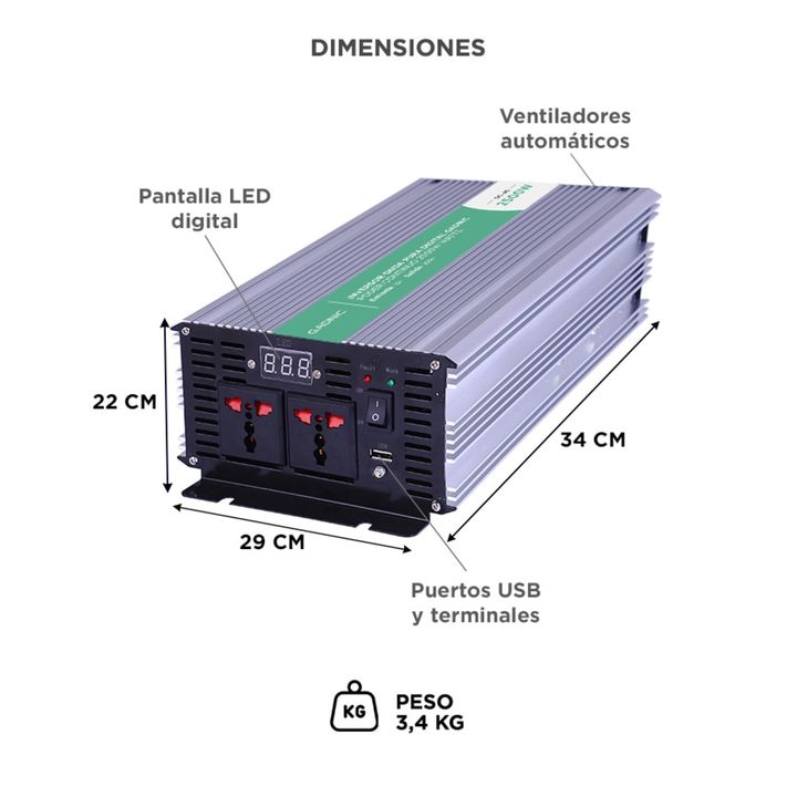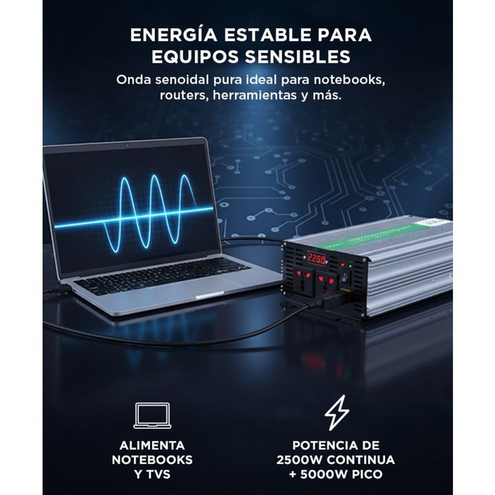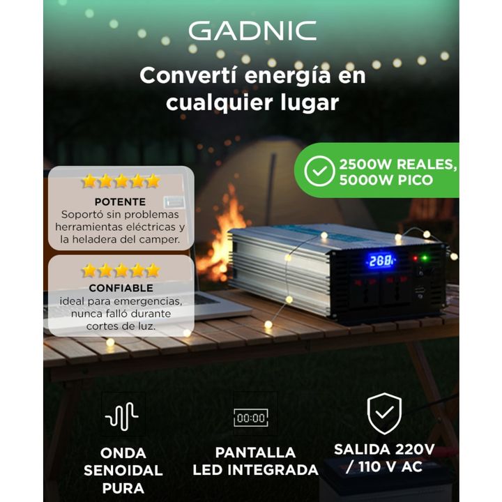 Convertí la energía de tu batería en una fuente confiable con el Inversor de Corriente Gadnic IV-12. Diseñado con una potencia de salida de 2500W y un pico de 5000W, ofrece un rendimiento estable con onda senoidal pura para proteger tus dispositivos. Cuenta con protecciones inteligentes contra sobre...