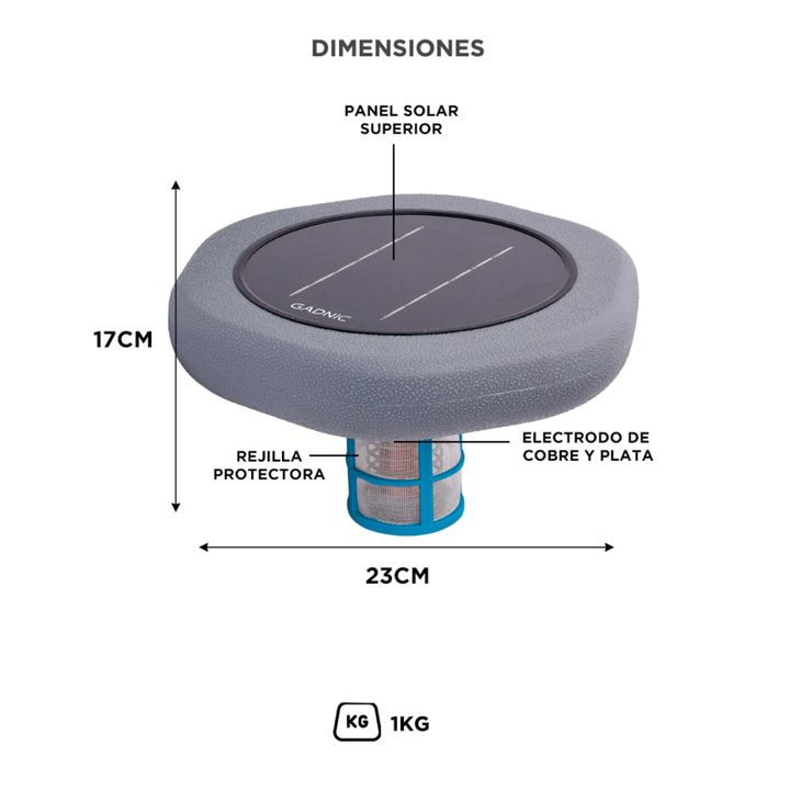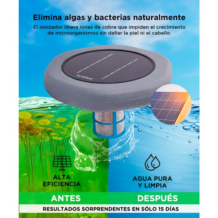 Purificación Natural sin Cloro: Mantené el agua de tu pileta cristalina, saludable y libre de químicos agresivos gracias a la tecnología de ionización solar GADNIC. Este sistema convierte la luz del sol en energía limpia para liberar iones de cobre que eliminan algas, bacterias y minerales no desead...