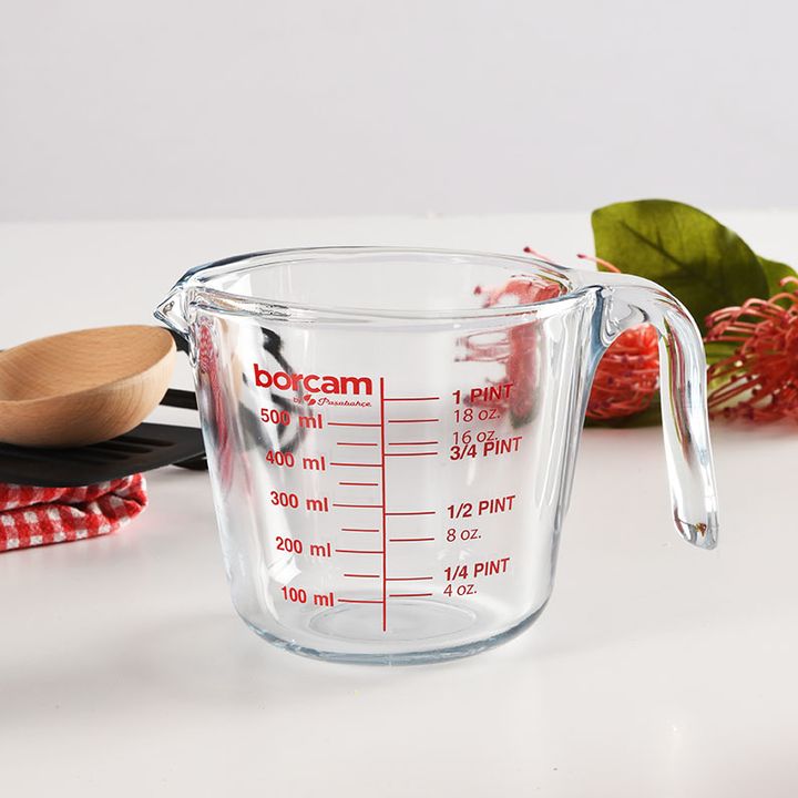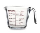 Jarra de Vidrio Resistente Robusta para multiples usos. Medida maxima : 500 ml Altura : 11 cms Diametro boca : 12,5 cms Diametro base : 9 cms Unidad de medida : litros , oz , tazas Se puede batir dentro Transparente Con pico vertedor y manija Marca : Borcam by Pasabahce Origen Turquia