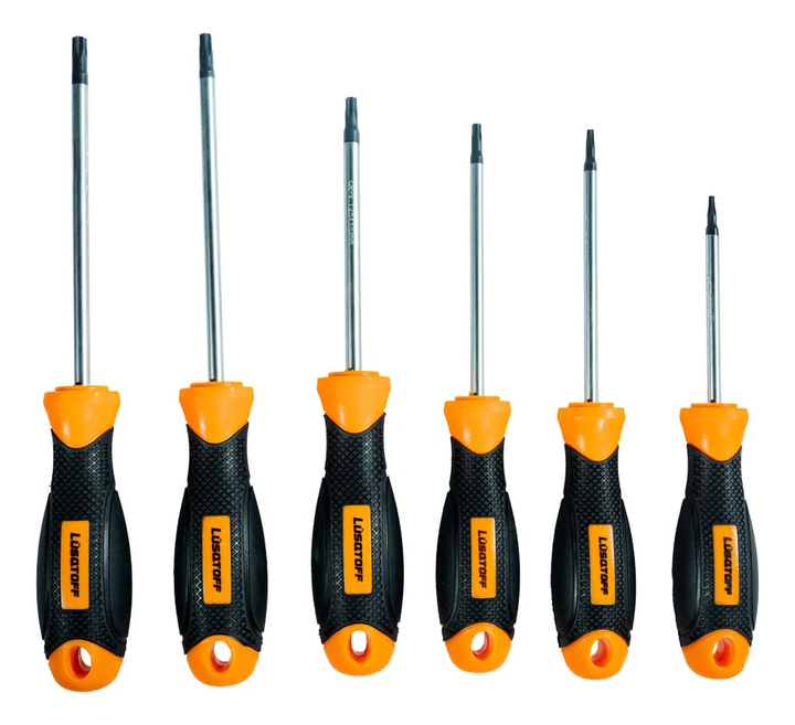 JUEGO DE 6 DESTORNILLADORES TORX LÜSQTOFF L6914 T10 - T15 - T20 - T25 - T27 - T30 • Medidas de puntas TORX: -- T10 x 75 mm -- T15 x 100 mm -- T20 x 100 mm -- T25 x 100 mm -- T27 x 125 mm -- T30 X 125 mm • Puntas imantadas para facilidad de uso. • Vara de acero cromo vanadio. • Cuerpo hexagonal con m...